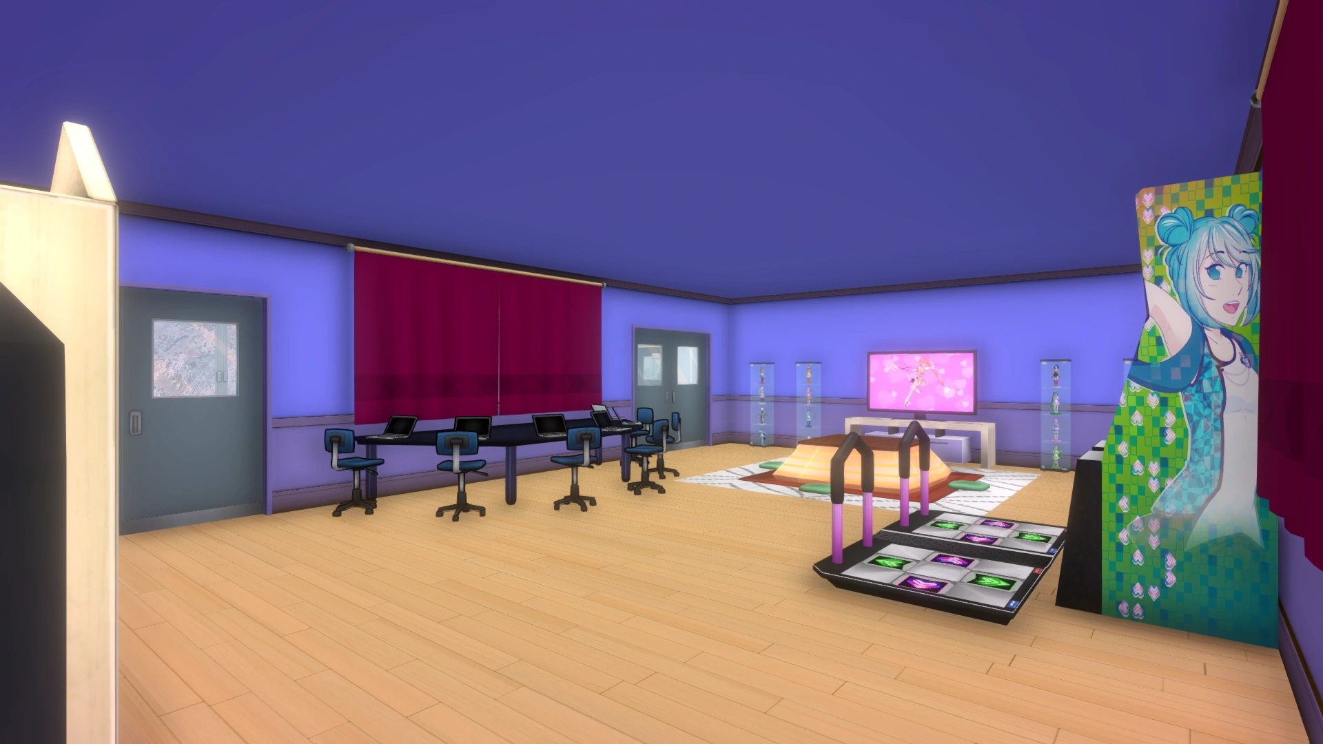 La salle possède des murs bleus, un plancher beige et des rideaux magenta foncé. Elle possède aussi un écran géant qui affiche Miyuki, ce dernier est relié à différentes consoles et lecteurs de marque Saikou, un kotatsu, une machine d'arcade, une machine de DDR qu'on peut utiliser sans forcément rejoindre le club, des vêtements, une cabine d'essayage, des vitrines où sont placées des figurines et une table en forme de demi-cercle sur laquelle sont posés six ordinateurs portables pour chacun des membres.
