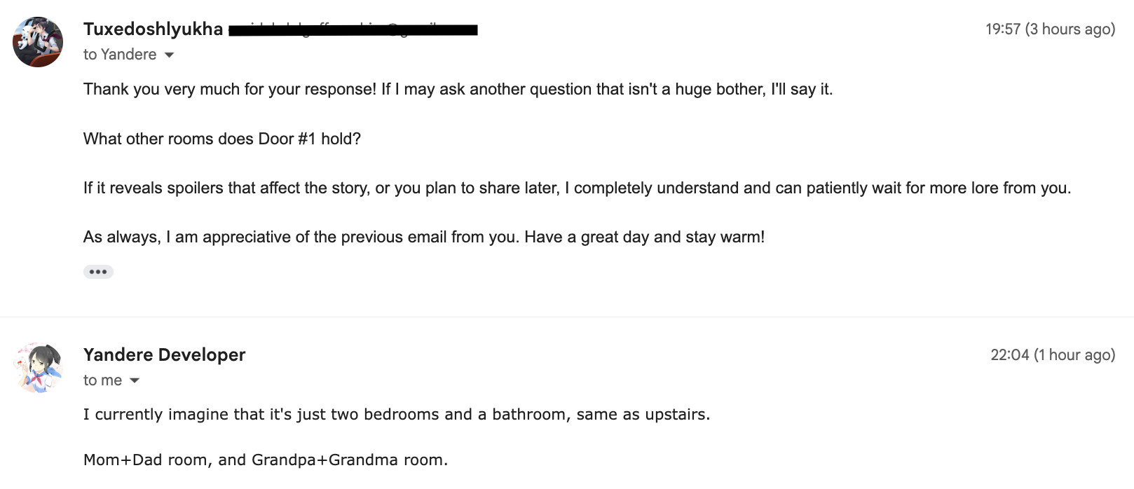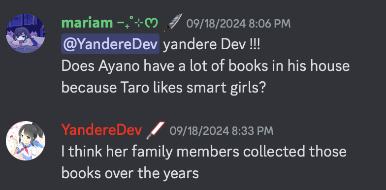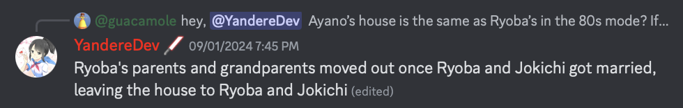 - Dal 15 aprile 2024, è ora possibile uscire dalla camera da letto di Ayano ed esplorare meglio la casa. Secondo YandereDev, voleva che Ryoba Aishi lasciasse un biglietto/cartolina ogni settimana, per avvisare Ayano di come stanno i suoi genitori.