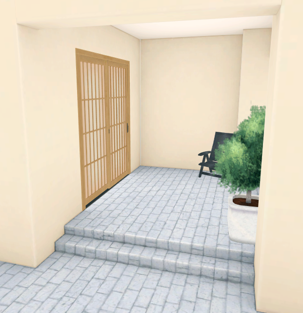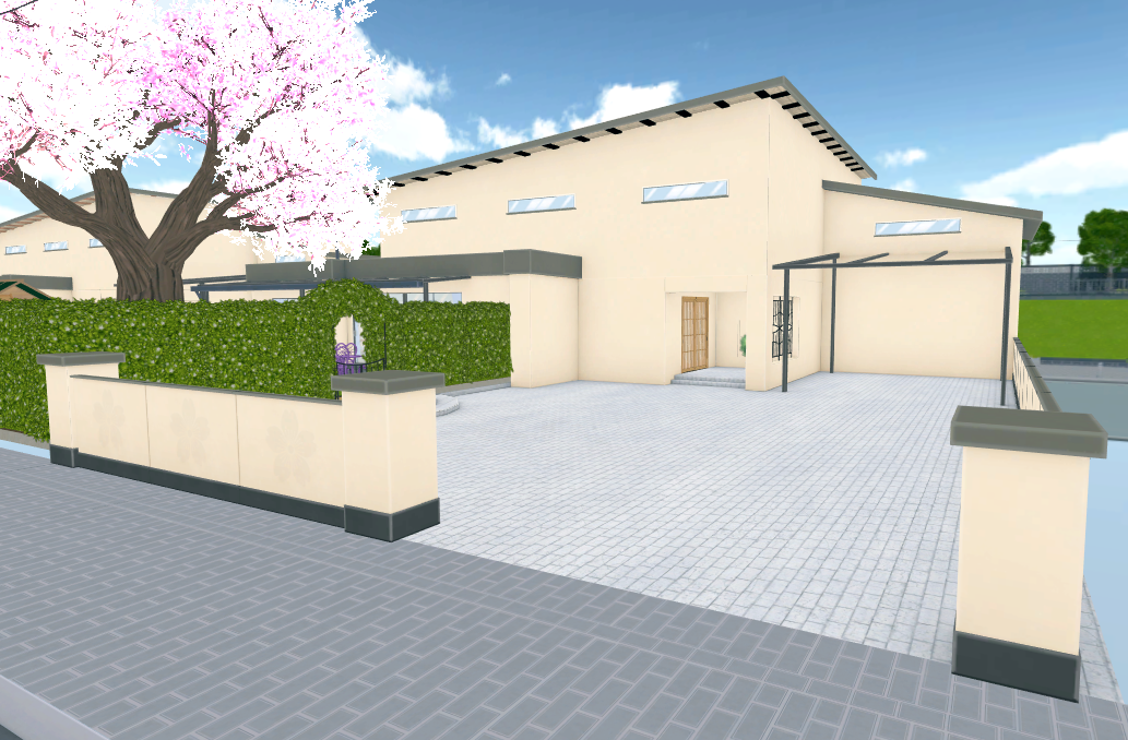 L'area del garage è vuota, con un pavimento in mattoni grigio chiaro. Ci sono anche delle tende parasole in tutto il cortile e nel garage, sebbene non si veda alcun telo o altro materiale sopra i pilastri metallici. Si tratta di un'area aperta della casa. La casa ha anche due ingressi, uno che conduce al cortile e un altro che conduce al soggiorno. L'ingresso del cortile sul retro è leggermente rialzato e delimitato da un ingresso a siepe e da un cancello nero curvo. L'ingresso del soggiorno comprende una piccola sala d'attesa con una sedia da giardino grigio scuro, una grande pianta in vaso e pilastri circondati da oggetti con una finestra con cancello al centro. Sebbene si trovi nel giardino, si può vedere un grande Albero di Ciliegio che sporge oltre la siepe.