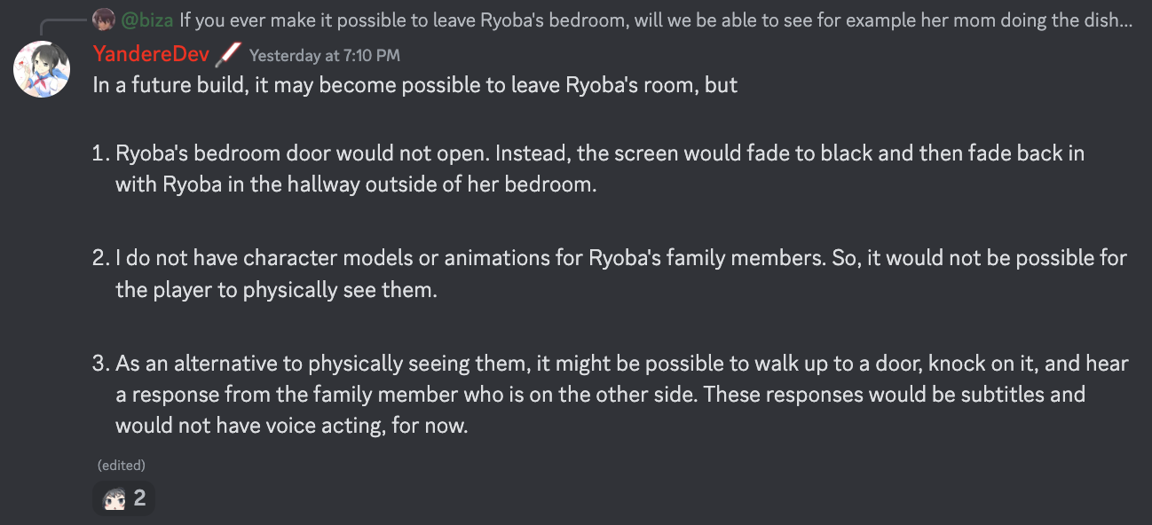 - ↑ https://yanderedev.wordpress.com/2016/05/17/may-preview-3-and-delay-explanation/