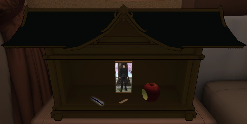 Yandere-chan fez seu próprio Santuário do Senpai. Seu santuário inclui um retrato de Senpai, uma maçã que Senpai mordeu, um curativo usado por Senpai, uma escova de dentes do Senpai, sua cueca, uma lata que ele amassou e mechas do seu cabelo.