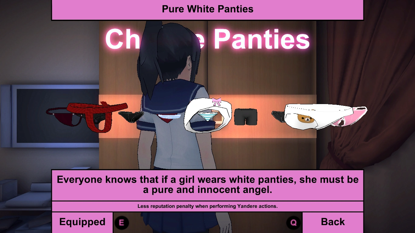 Yandere-chan tem calcinhas que dão certos impulsos ao longo de um dia de escola. Em uma versão anterior do jogo, uniformes escolares diferentes foram usados para dar impulsos. As calcinhas brancas estão atualmente equipados por padrão.
