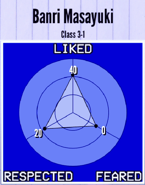 Among the personas that are currently implemented in the game, Banri is a Snitch. If he sees a corpse or witnesses a murder, he will run to the landline phone in the Faculty Room and call the police. He cannot participate in physical fights against Ryoba Aishi unless he witnesses Kaguya's murder.
