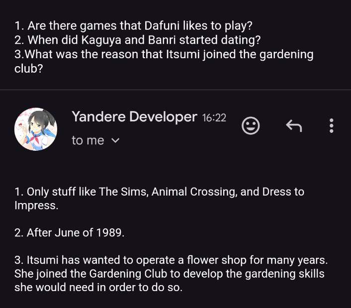 Banri has a crush on Kaguya and is her suitor. If he is matched with Kaguya, the two will begin a romantic relationship with each other, which will eliminate Kaguya. If he witnesses Kaguya's murder, he will run to Ryoba and try to apprehend her. YandereDev has stated that after the events of 1980s Mode, Banri approached Kaguya himself,[2] then they married, even though they were never matchmade, and had two kids together. [3][4] They started dating in Akademi after June of 1989.[5]