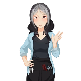 In her previous illustration, she had short, mid-neck length black hair with two swept bangs, one strand in the middle, and chocolate eyes. She also wore a V-line dark gray t-shirt covered by an open light blue cardigan with fitted cuffs, paired with a black apron that had gray scissors, two white clips, a brown stick, and a gray spray bottle. She also had two small baby blue dangle bracelets on her right wrist.