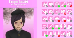 Among the personas that are currently in the game, Borupen is Spiteful. If he sees Ayano Aishi murder, or the corpse, of a student with a low reputation, or a student who is bullying him, he will be amused and compliment her on her crime, then run off in order not to be considered an accomplice. He will not talk to Ayano the next day after this happens. If he witnesses the murder or corpse of any other student, he will leave the school and call the police. If Ayano has her phone aimed at him, he will become annoyed and cover his face. He cannot participate in physical fights against murderers. If Ayano attempts to intimidate Borupen to follow her as a delinquent, he will be "immune" to the intimidation and refuse to comply with her request.