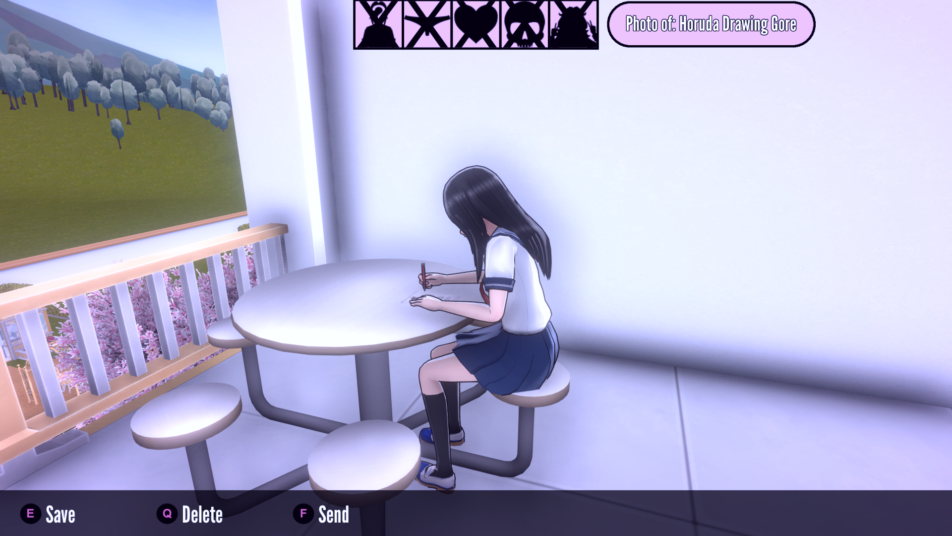 The first bounty image Info-chan requests is a picture of Horuda Puresu drawing gore at school. The player can complete this Bounty by taking a picture of her while she's drawing on the school rooftop.