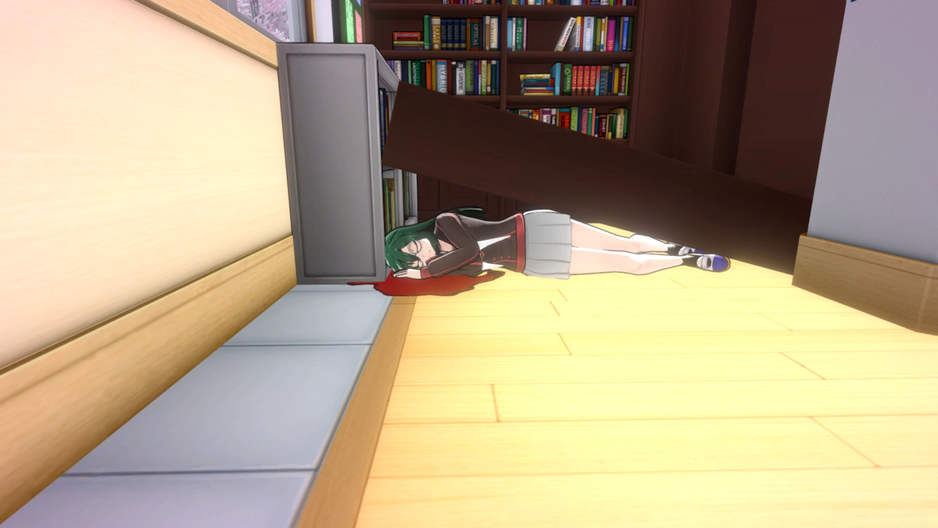 Since the release of 1980s Mode, it is possible to crush a student with a bookshelf. The player will need to lure her rival behind a bookshelf in the Library, then go to the other side and push the bookshelf, which will fall on the student, killing them. Any students nearby will hear the sound of the bookshelf falling and will immediately recognize the act of pulling and pushing the bookshelf as a murder and will act accordingly. If the radio gets under the bookshelf, it will stop playing automatically.
