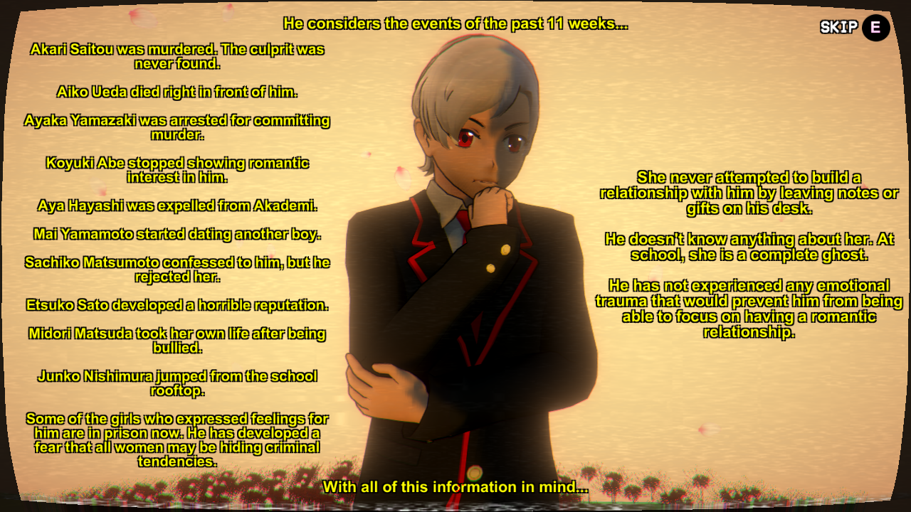 By the end of the 11th week, the protagonist will attempt to confess to her Senpai. Depending on the various factors, such as how exactly the rivals were eliminated, her reputation at school and if she attempted to make any gifts to them or not and if they were mentally affected by the past events, they will either accept the confession or reject her.
