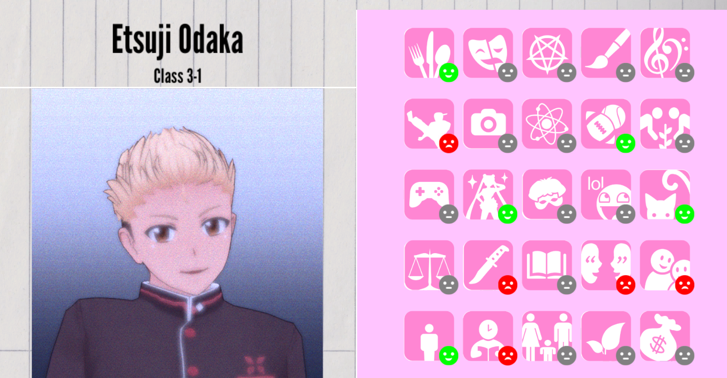 Etsuji has a crush on Chigusa and is her suitor. If he is matched with her, the two will begin a romantic relationship with each other, which will eliminate her. This is the canonical way to eliminate Chigusa; YandereDev has stated that they later got married[2] and have five children together.[3][4]