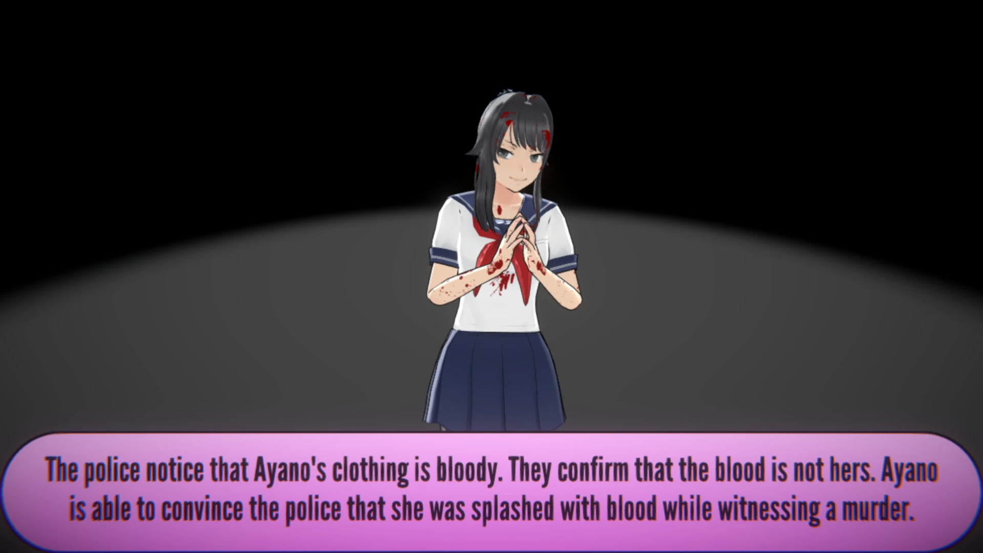 However, if the player frames a student but then kills them, and forgets to remove their bloody clothing, the police will note that the blood on Ayano's clothing is not hers. This time she will be unable to convince the police she did not commit murder.