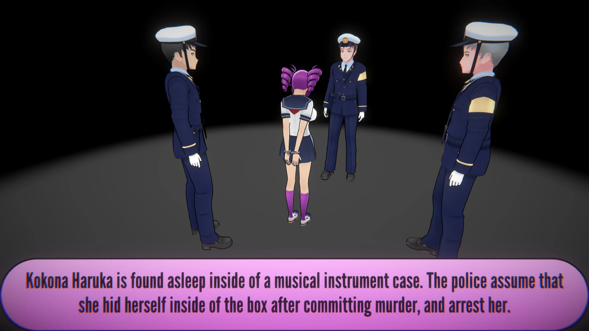 If the player tries to frame a female student while kidnapping her, the police will find her sleeping inside the storage room used for kidnapping. They will assume that she hid from the police and will arrest her.