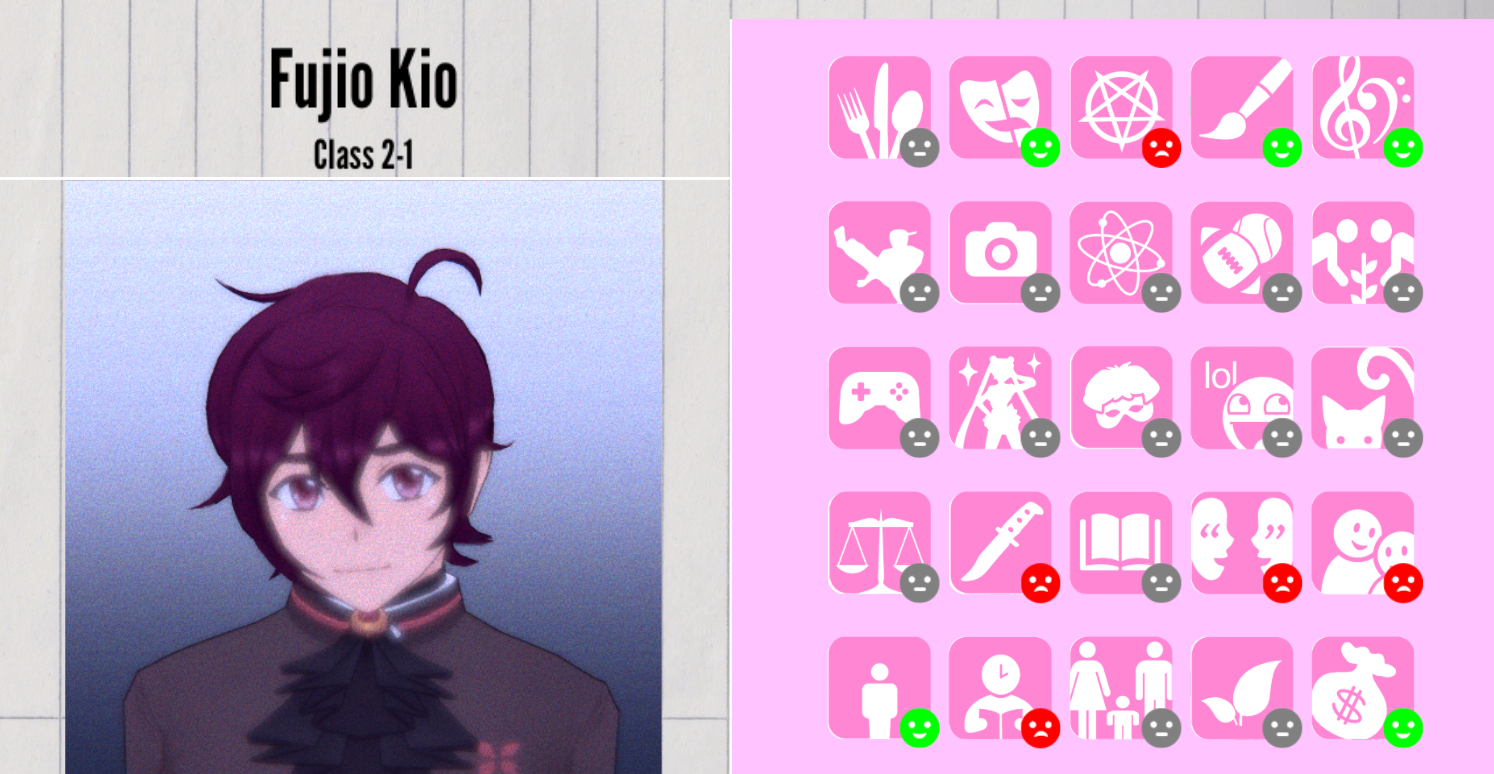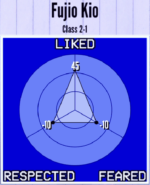 Among the personas that are currently implemented in the game, Fujio is a Snitch. If he sees a corpse or witnesses a murder, he will run to the landline phone in the Faculty Room and call the Police. He cannot participate in physical fights against murderers.