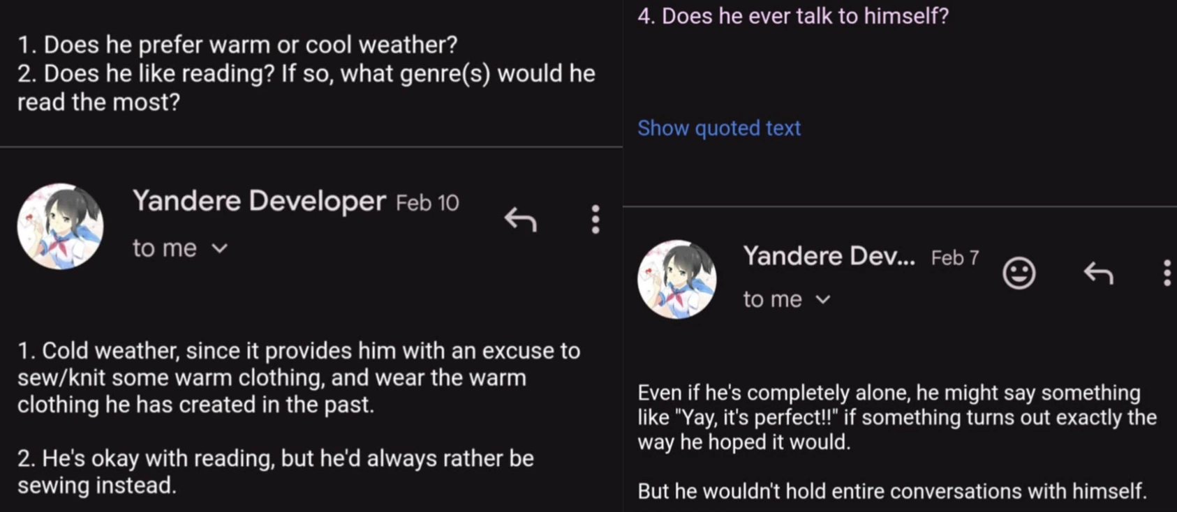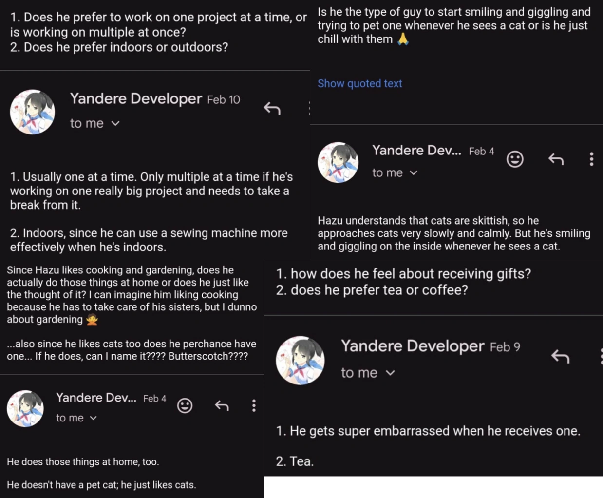 Hazu collects objects that could be considered trash or useless if it has some "sort of aesthetic or decorative value", according to YandereDev.[17]