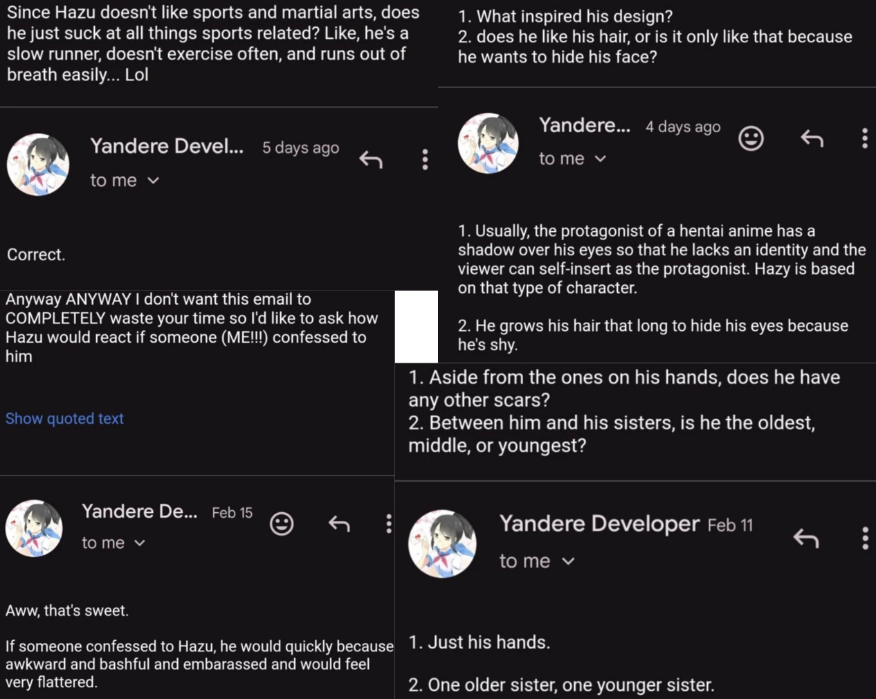 YandereDev imagines that Hazu's hands have a lot of small, minor scars that are a result of moments when he made mistakes while learning how to sew.[2] These are the only known scars.[3]