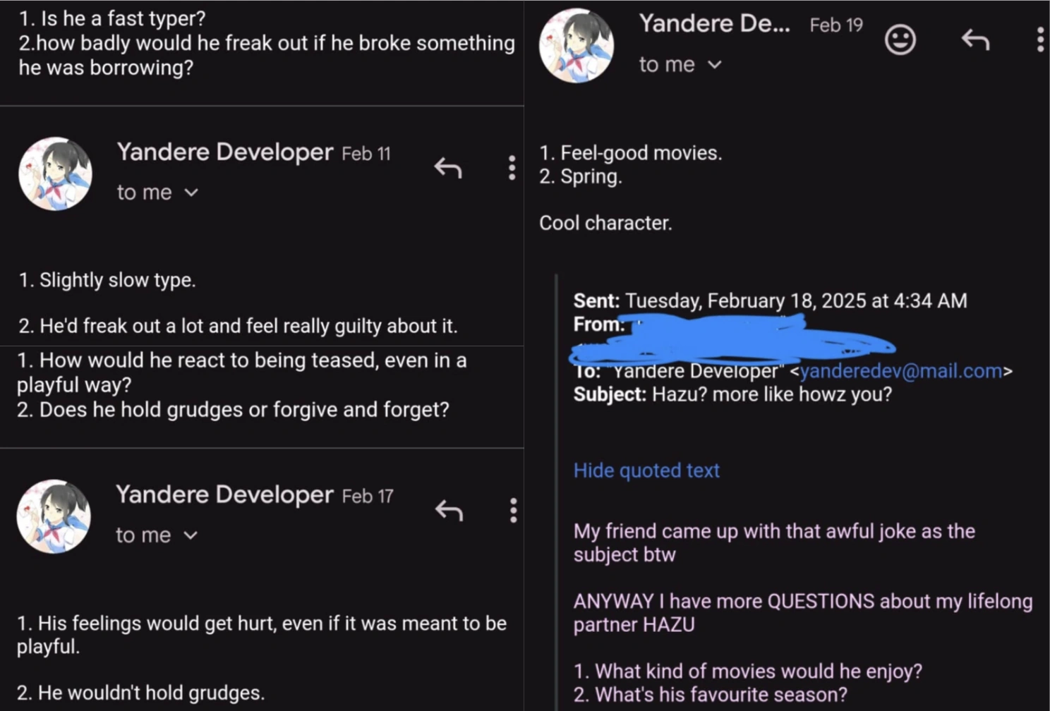 Hazu's family is laid-back, according to YandereDev.[13]