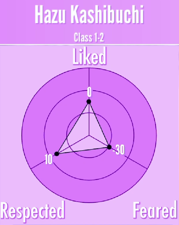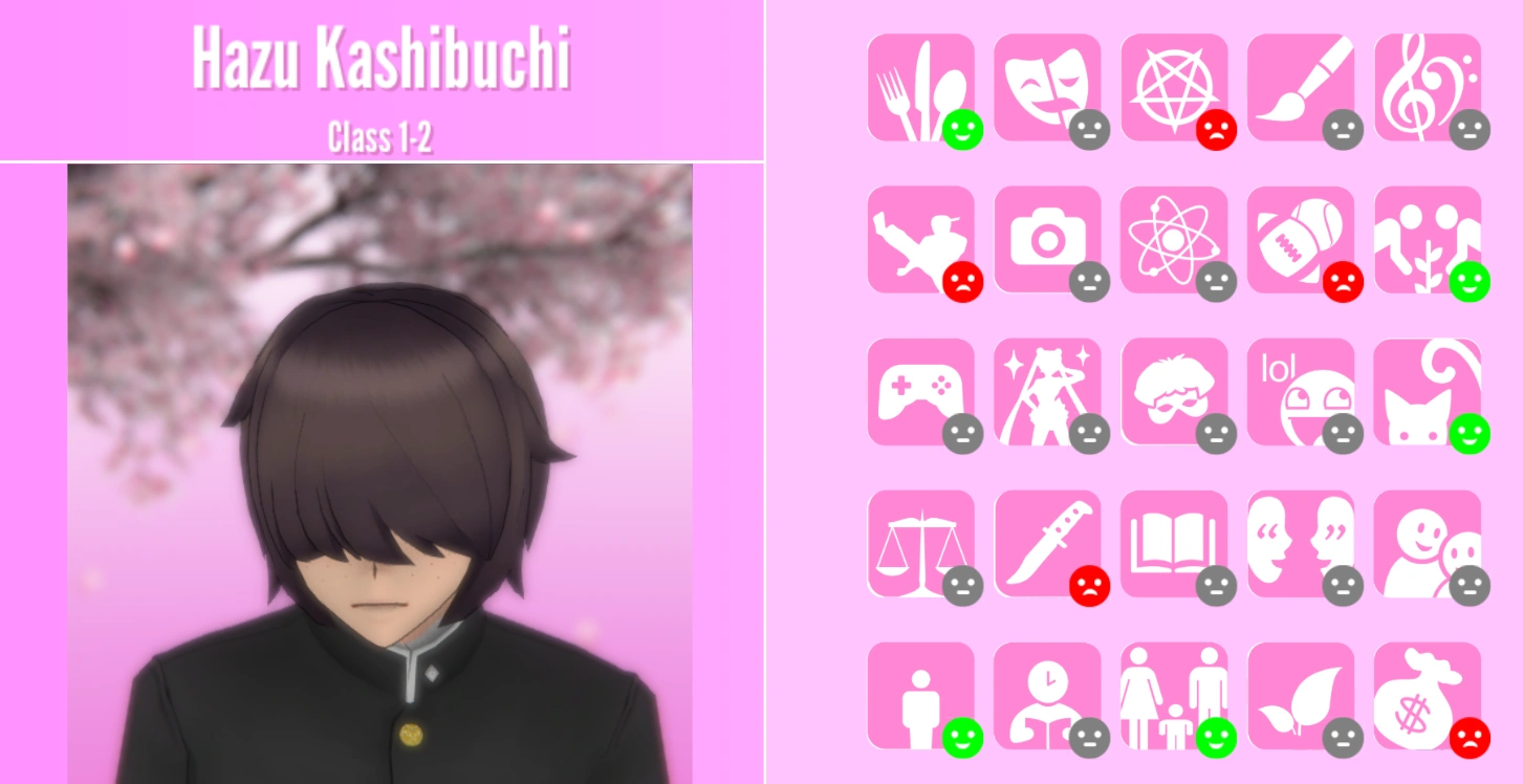 Among the Personas that are currently implemented in the game, Hazu is a Coward. If he sees a corpse, he will run away from school and call the police. If he witnesses a murder, he will start begging for Ayano Aishi to spare his life in exchange for his silence and then run out of the school. He cannot participate in physical fights against murderers. If Ayano aims her phone at him, he will cover his face.