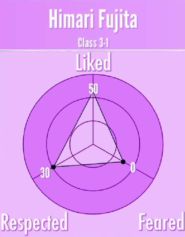 Among the Personas that are currently implemented in the game, Himari is Heroic. If she witnesses Ayano Aishi commit murder, she will run up and fight her, starting the struggle minigame. The struggle minigame against Himari would be relatively easy, as she is very weak. If she wins, Ayano will be Apprehended. If she loses, Ayano will stab her in the back of her head, killing her. She will give Ayano a suspicious look if she aims her Phone at her.