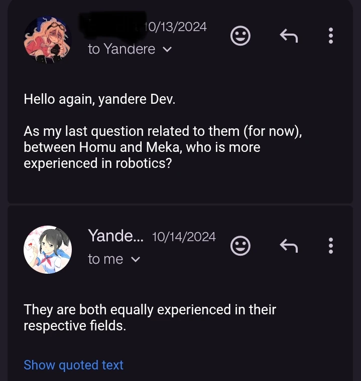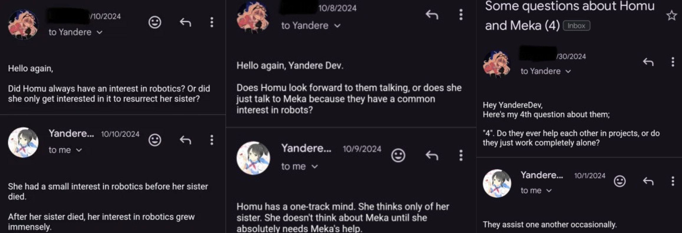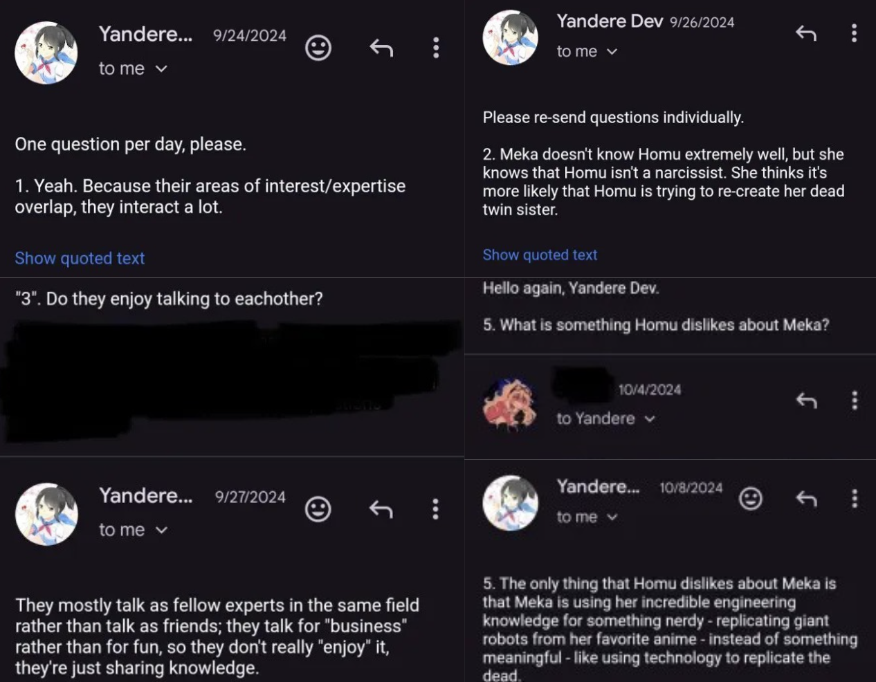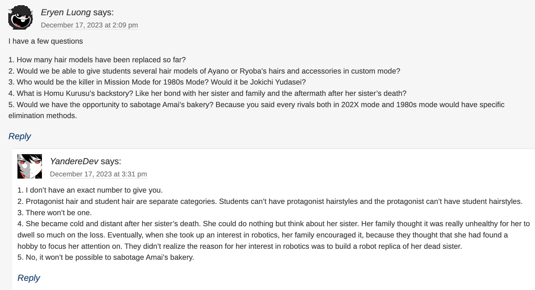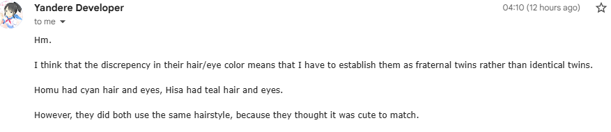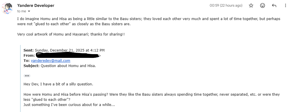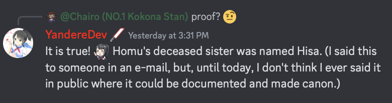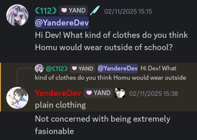 YandereDev describes Homu's mind as "one track", as she only thinks about her sister and not anybody else.[6]