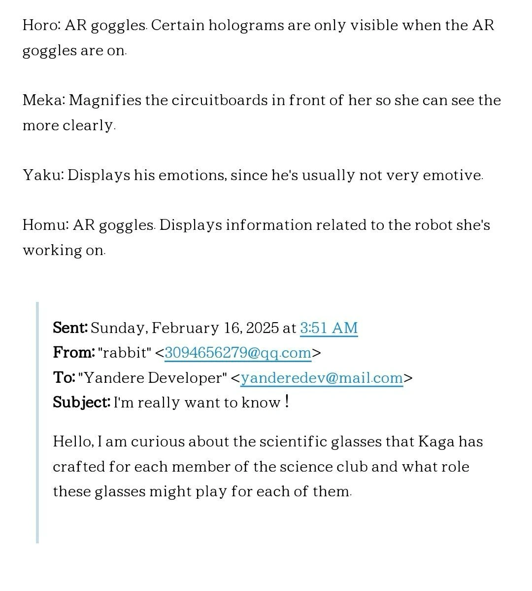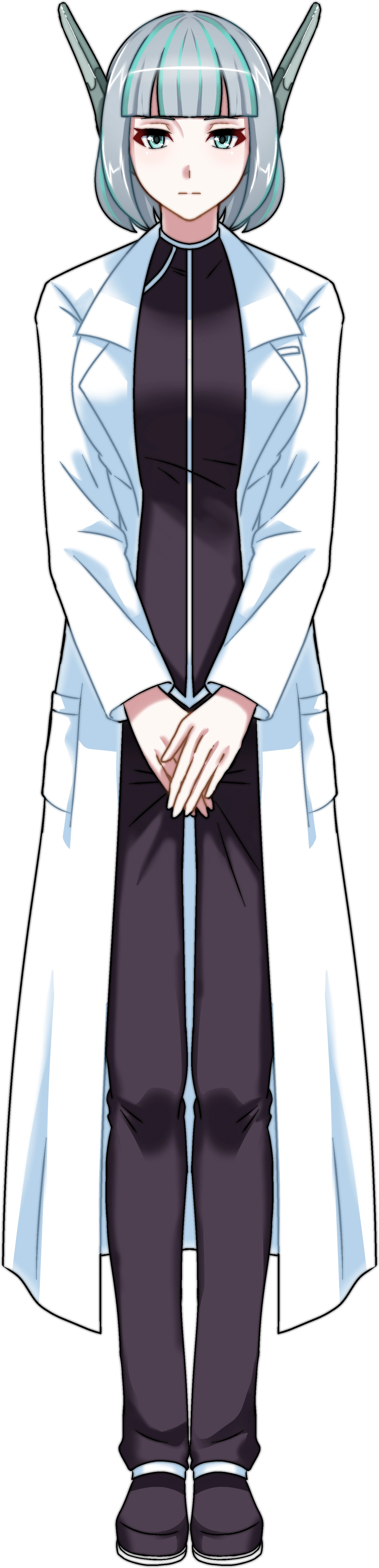 She wears the default school uniform with pointed robotic ears, which are dark-gray at the bottom and get lighter at the tips, that stick out of her head unless customized by the player. When in the Science Club, she will wear a white lab coat. Unlike other members of the Science Club, she does not wear a visor. If the club disbands, she will stop wearing the pointed robotic ears.