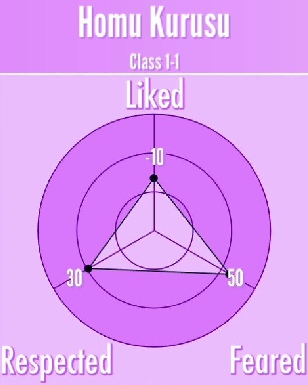Among the Personas that are currently implemented in the game, Homu is a Teacher's Pet. She will give Ayano Aishi a suspicious look if she aims her phone at her. If she sees a corpse or witnesses a murder, she will report to her teacher, unless another Teacher's Pet has already. She cannot participate in physical fights against murderers.