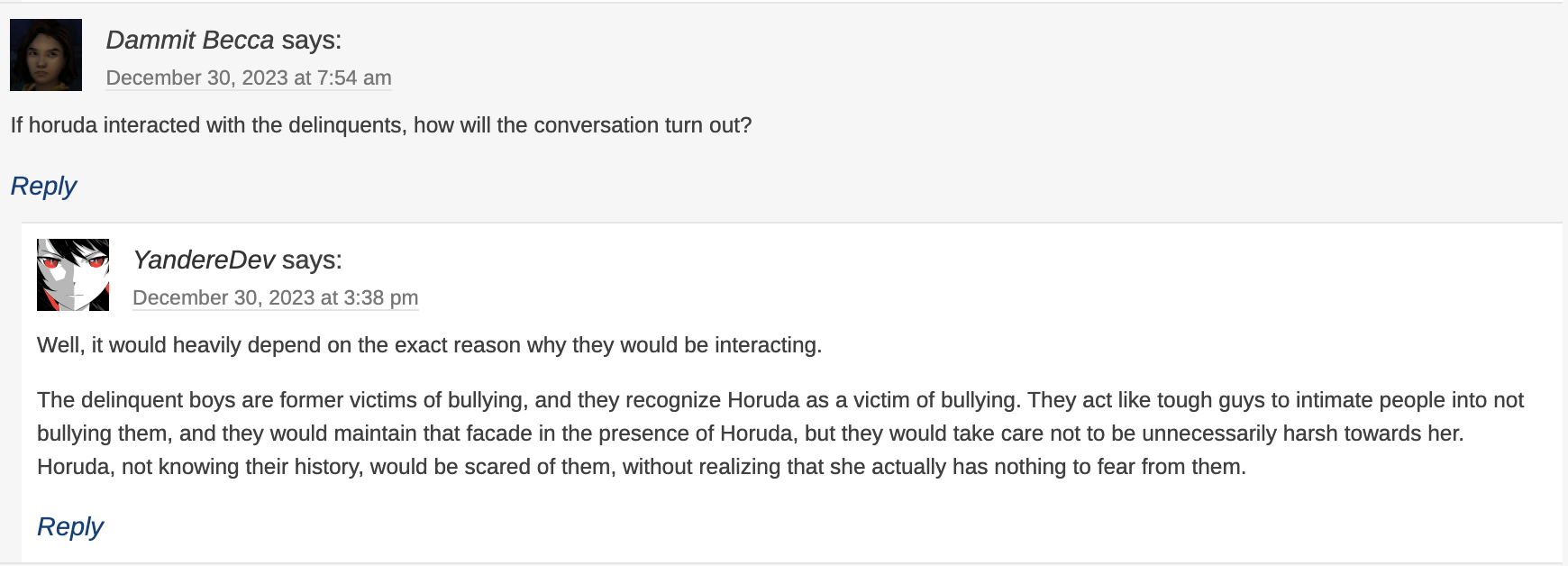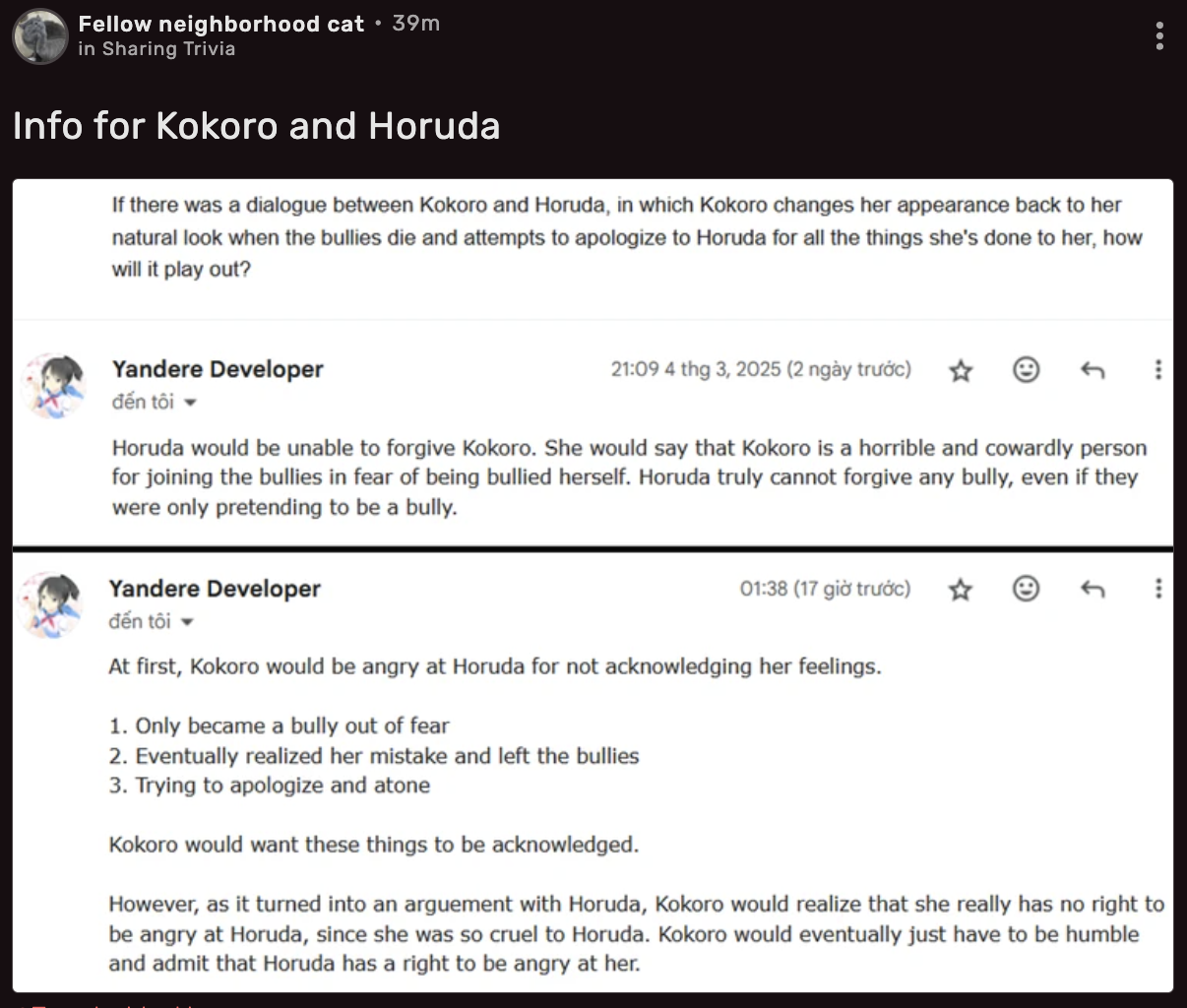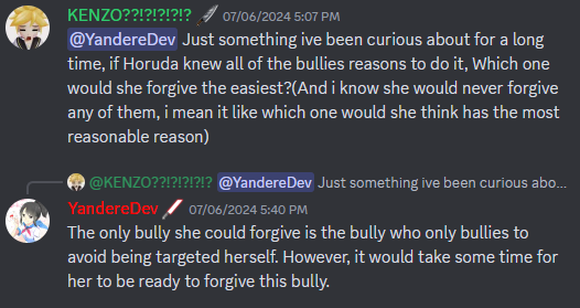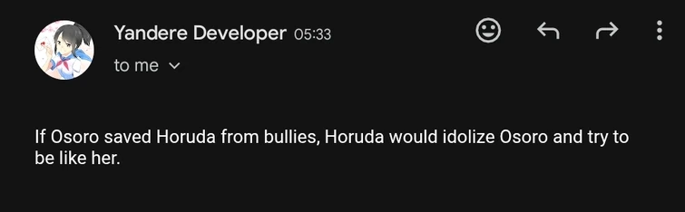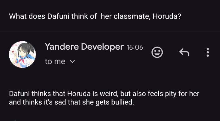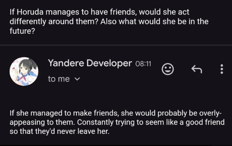 YandereDev says that while Horuda could forgive Kokoro, it would take some time.[17]