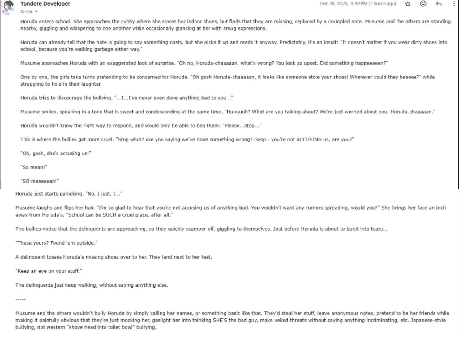 The bullies often taunt Horuda by stealing the latter's stuff, leaving anonymous notes, gaslighting her, pretending to be her friend while making it clear that they're not friends, saying veiled threats without any grounds of incrimination, and many more.