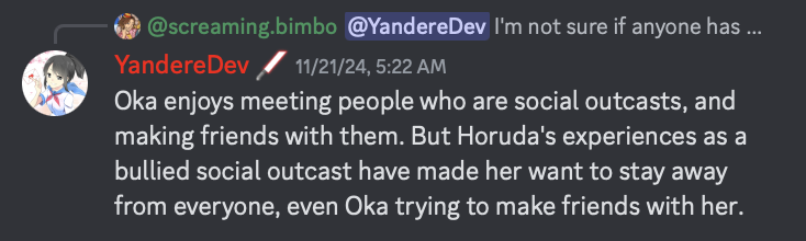 - She was added to YandereDev's "Characters" on November 14th, 2024.