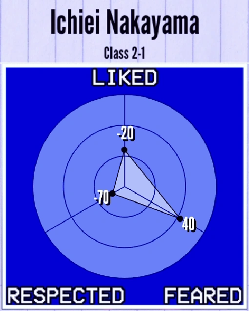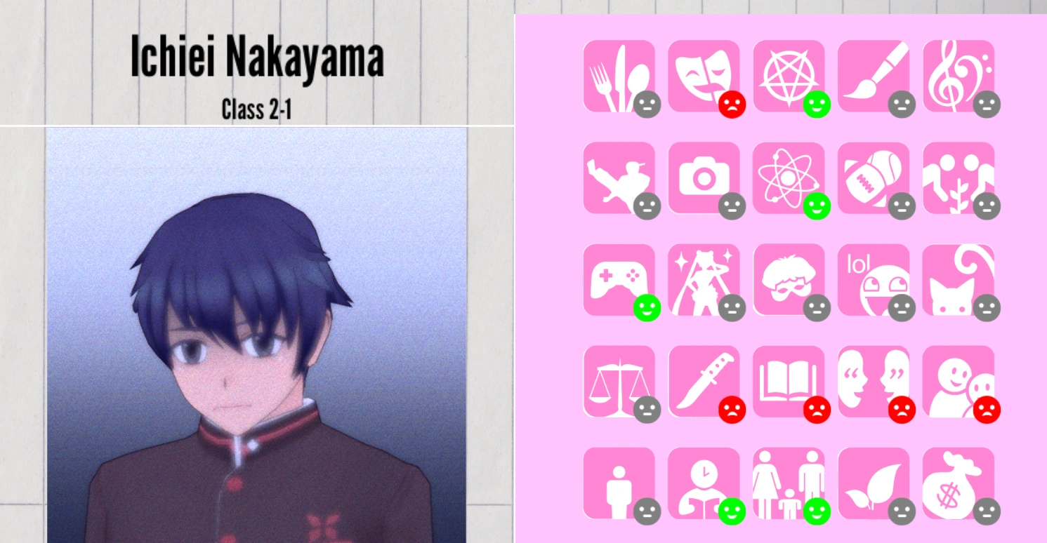 Among the Personas currently implemented in the game, Ichiei is a Coward. If he sees a corpse, he will run away from school and call the Police. If he witnesses a murder, he will start begging for Ryoba Aishi to spare his life in exchange for his silence. After that, he will run away from school but won't call the police. He cannot participate in physical fights against murderers.