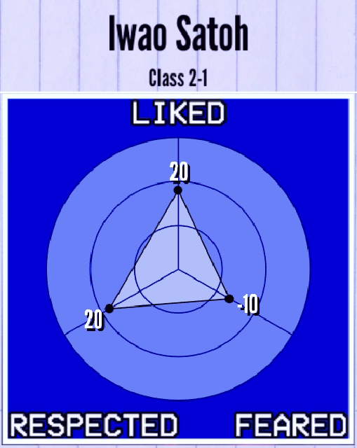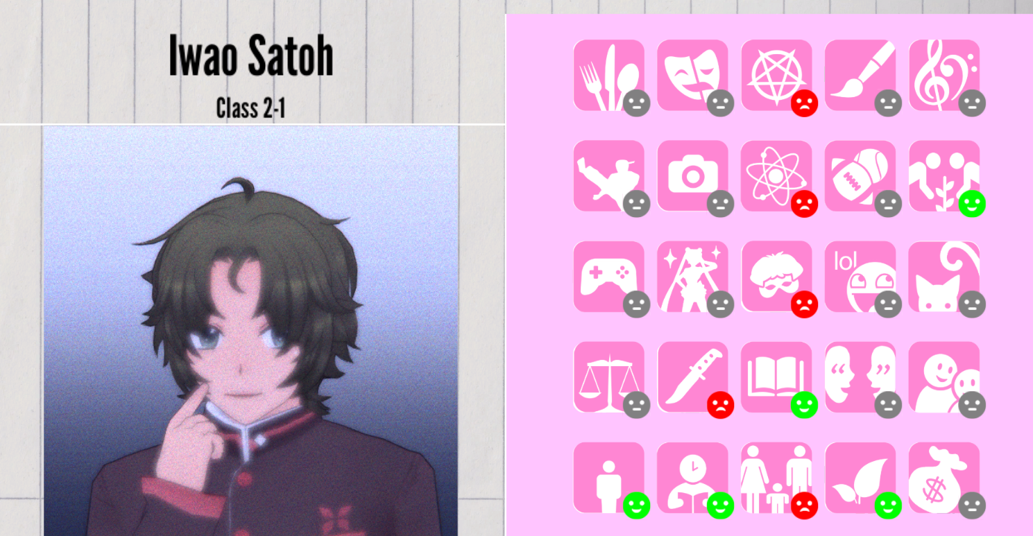 Among the Personas that are currently implemented in the game, Iwao is a Snitch. If he sees a corpse or witnesses a murder, he will run to the landline phone in the Faculty Room and call the Police. He cannot participate in physical fights against murderers.