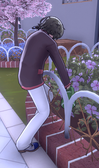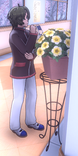 At 7:00 AM, Iwao enters the school grounds. He walks to his locker at 7:05 AM and changes his shoes. After doing so, he will head over to the back of the school to water plants along with the other Gardening Club members.