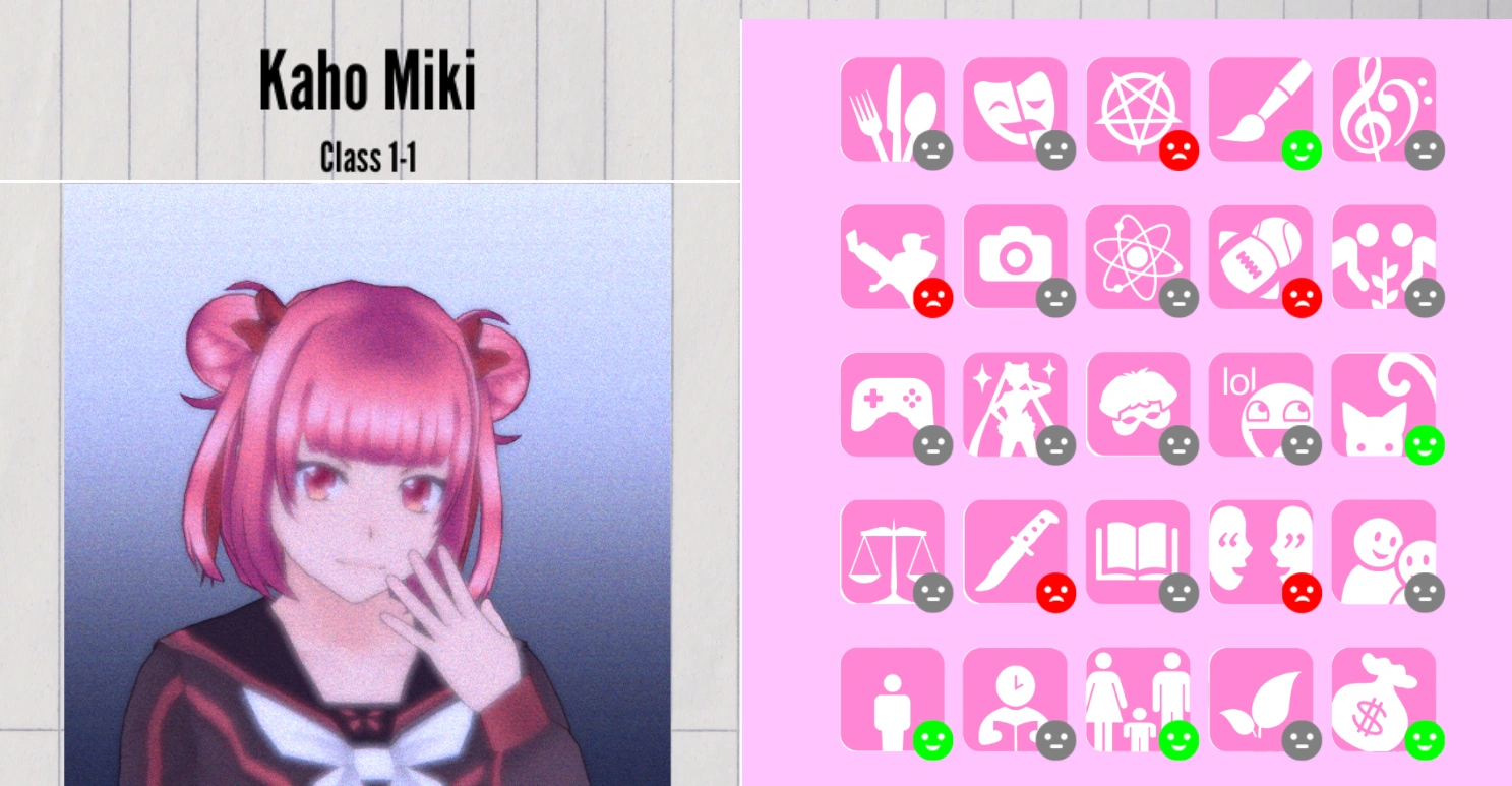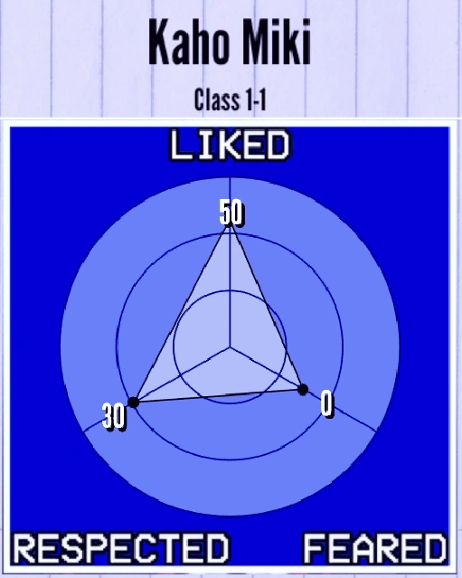 Among the personas that are currently implemented in the game, Kaho is a Snitch. If she sees a corpse or witnesses Ryoba Aishi commit murder, she will run to the landline phone in the Faculty Room and call the Police. She cannot participate in physical fights against murderers.