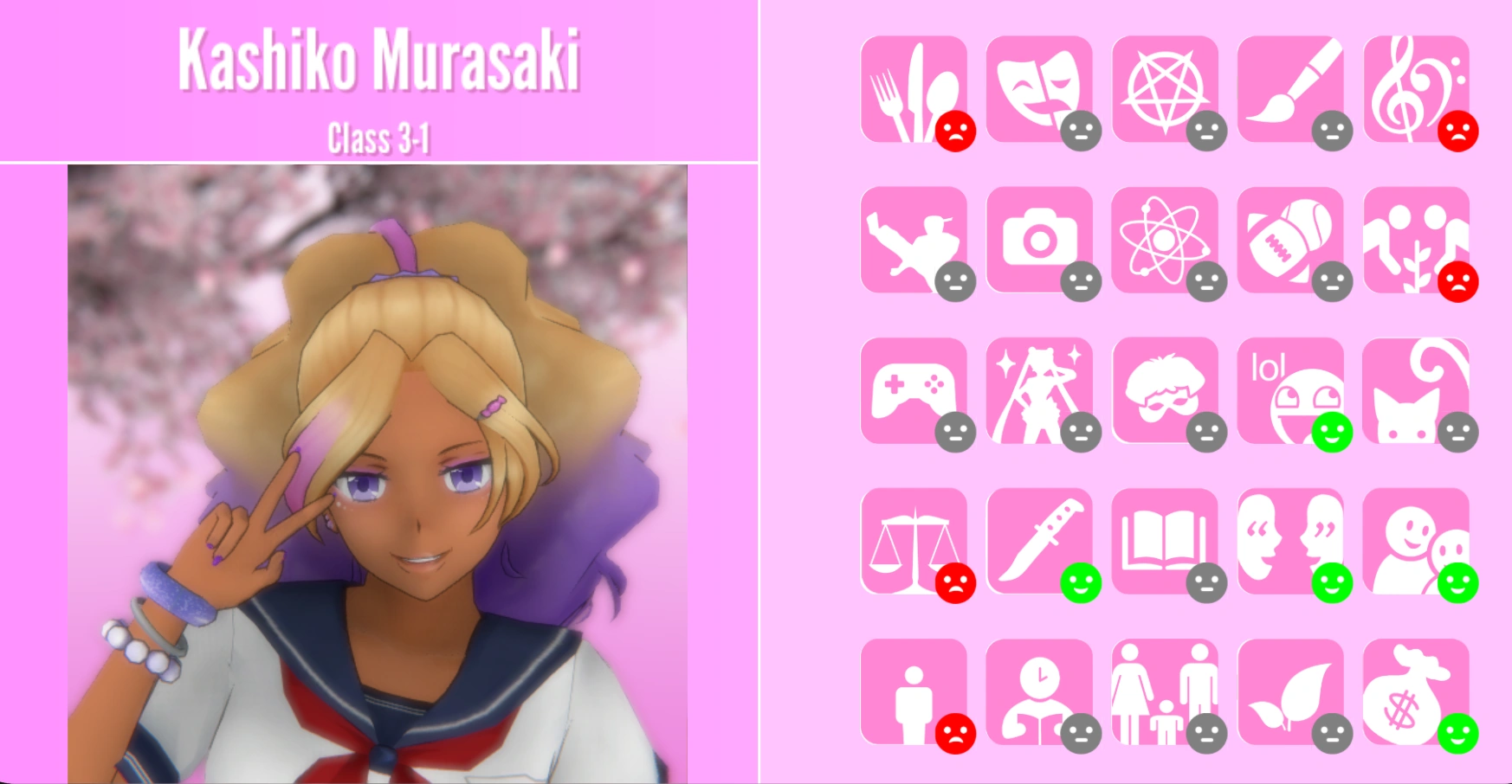 Kashiko is a member of the Bullies, meaning that she will talk behind people's backs and bully those with the lowest reputation, and write abusive words on their desks. If Ayano has a high reputation, she will smile and put away her phone when she talks to her. If Ayano has a regular or low reputation, she will give her an annoyed expression, as if she's wasting her time.