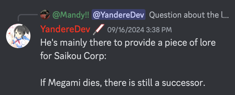 - ↑ https://www.reddit.com/r/yandere_simulator/comments/f2jx1s/some_questions_ive_always_wondered_about_megami