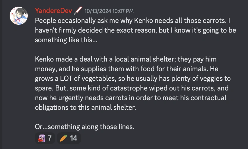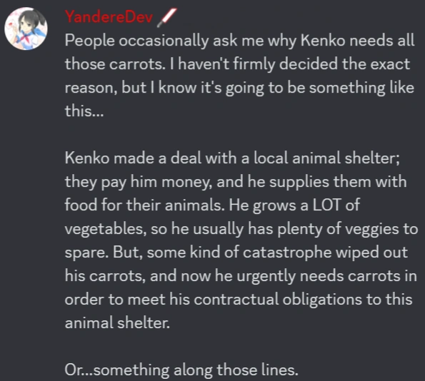 Because of his inconsistent replies, nobody is entirely sure what the truth is, what he *really* needs that number of carrots for, or why he feels a need to hide his true intentions. This has led to many wild theories, ranging from "He enjoys swimming naked in a giant swimming pool full of carrots" to "He is holding someone prisoner in his basement and is forcing them to eat carrots." Perhaps no-one will ever know the truth aside from Kenko himself.