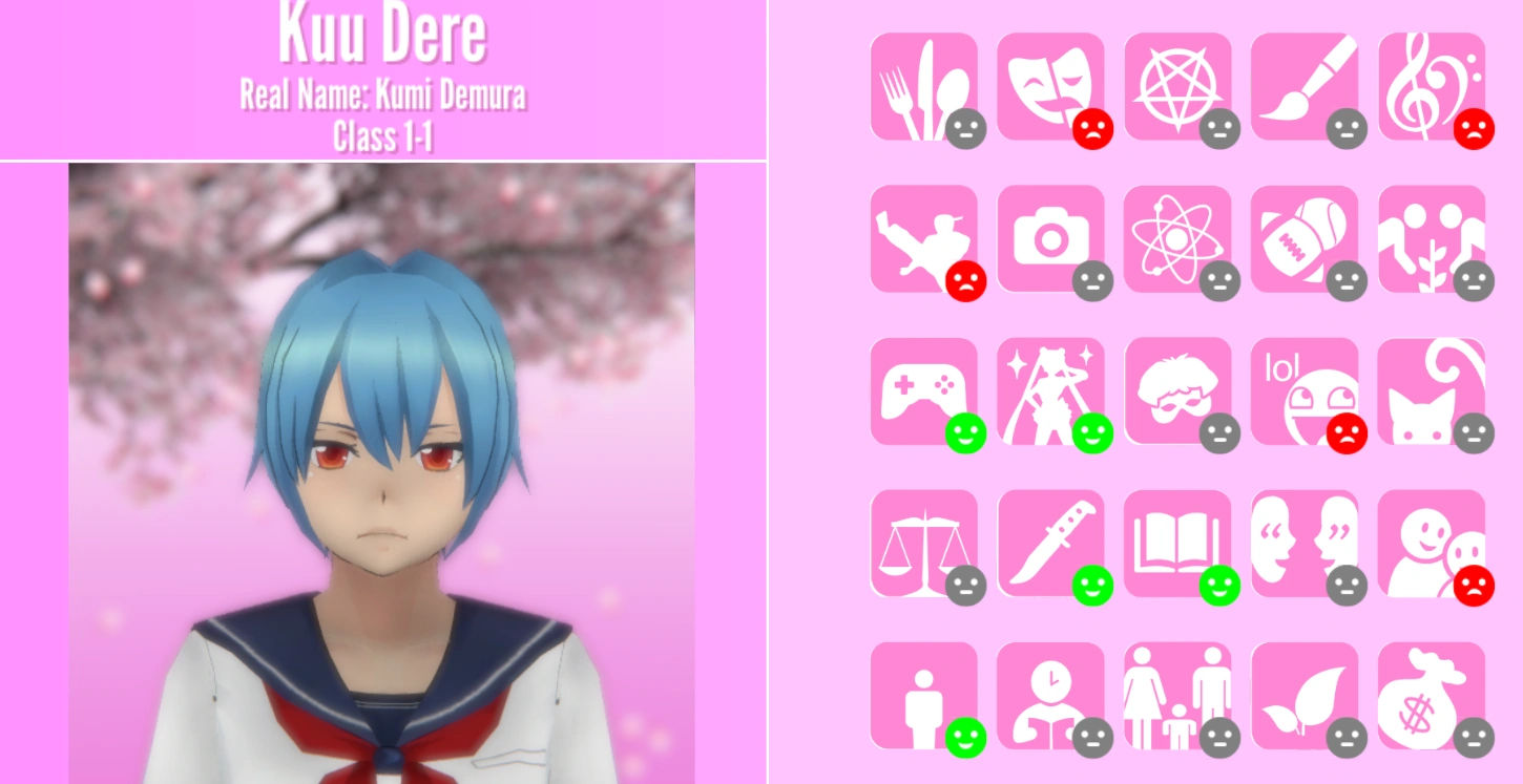 Among the Personas that are currently implemented in the game, Kuu is a Loner. If she sees a corpse or witnesses a murder, she will run out of school and call the Police. She cannot participate in physical fights against murderers. She will hide her face if Ayano Aishi aims her Phone at her.