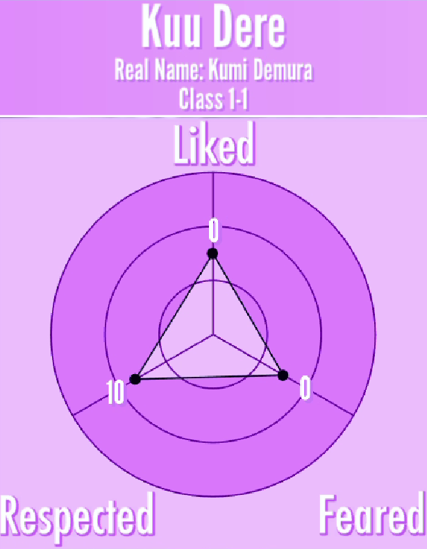 In reality, though, Kuu is only pretending to be emotionless because she thinks that acting cold and distant makes her seem cool and mysterious when other people think of her.[2] Kuu's liking of violence is a "weird quirk of hers".[3] She secretly has dark thoughts and wants to see violence visited on the people that she dislikes.[4] At one point, it was planned that Kuu would have a unique reaction to murder. This, however, was a special case that applied only to her and Robot-chan and would be difficult from the programming side.[5] This persona may have been called "Apathetic".[6] This idea has since been scrapped.