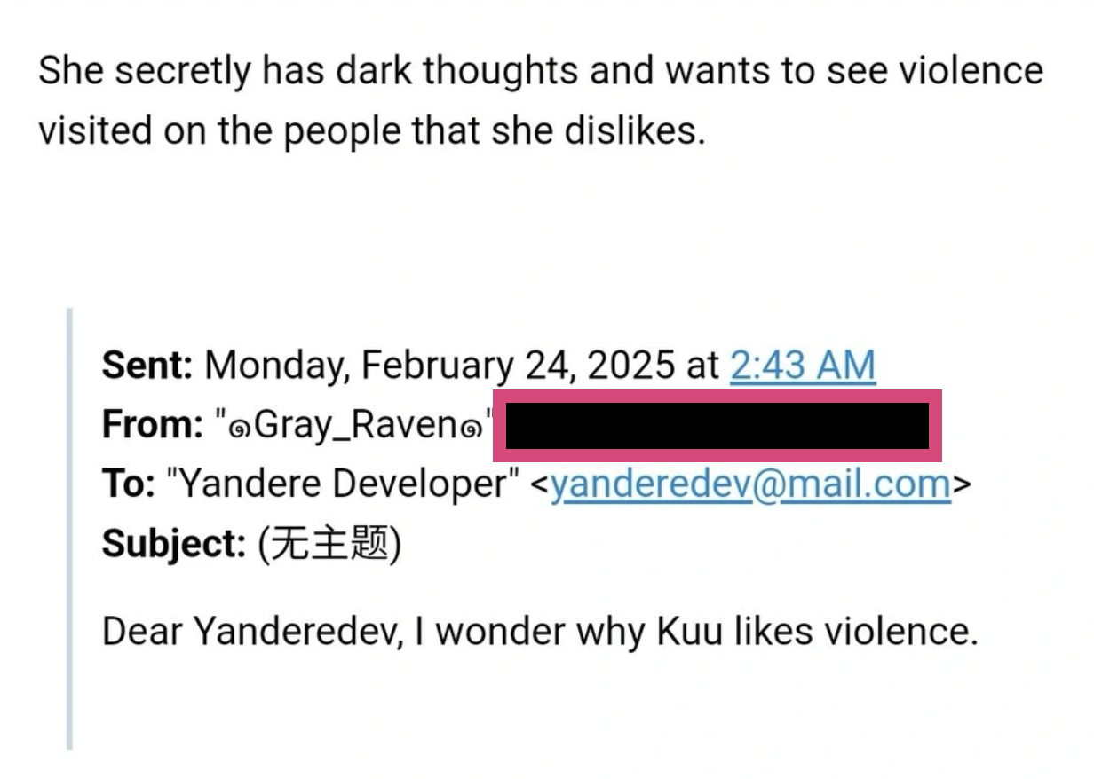 - ↑ https://www.reddit.com/r/yanderesimulator/comments/8yxm0f/comment/e2gk82e