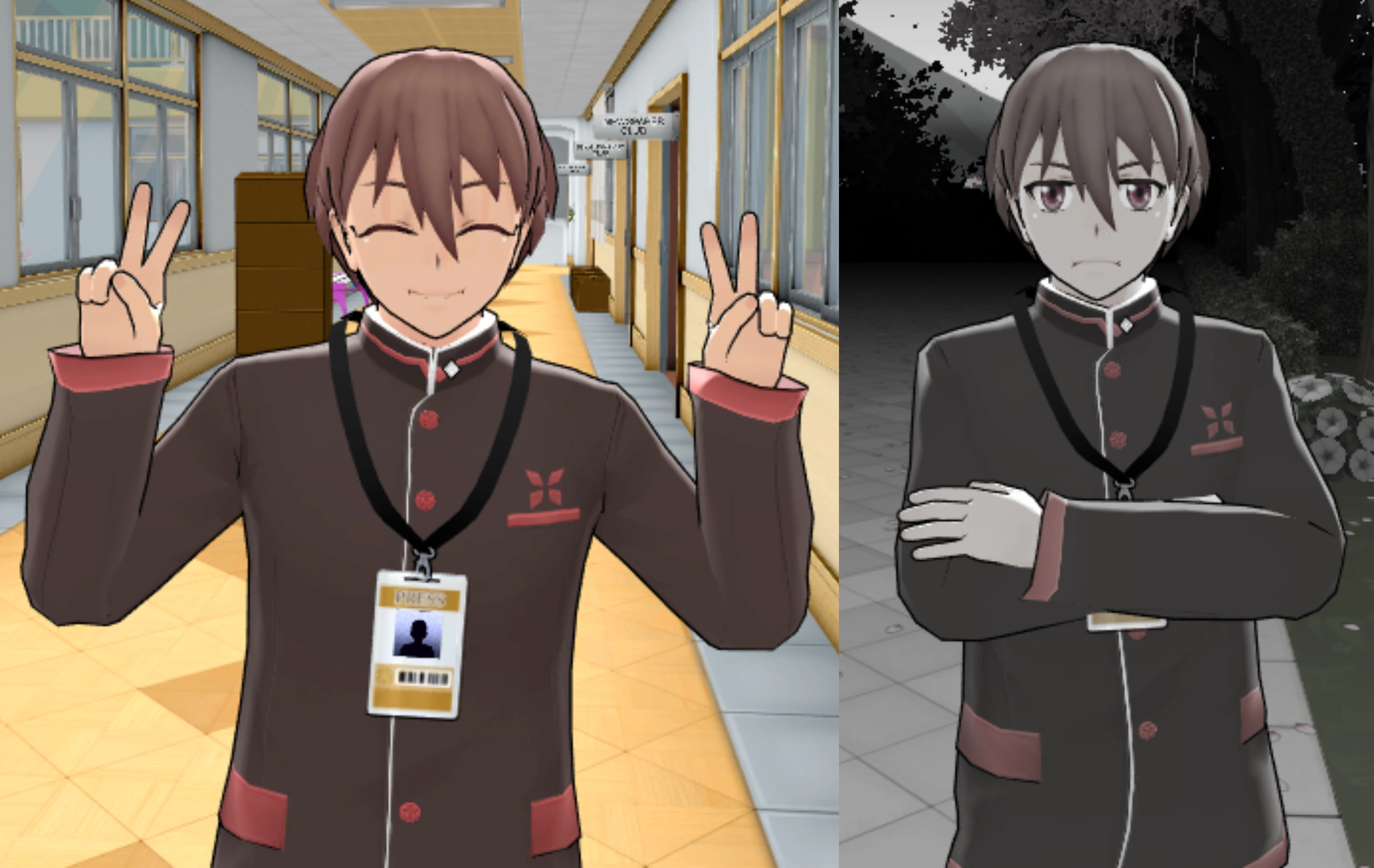 He wears the default 1980s uniform with a reporter's ID on a black lanyard around his neck. If the club disbands, he will stop wearing the reporter's ID.