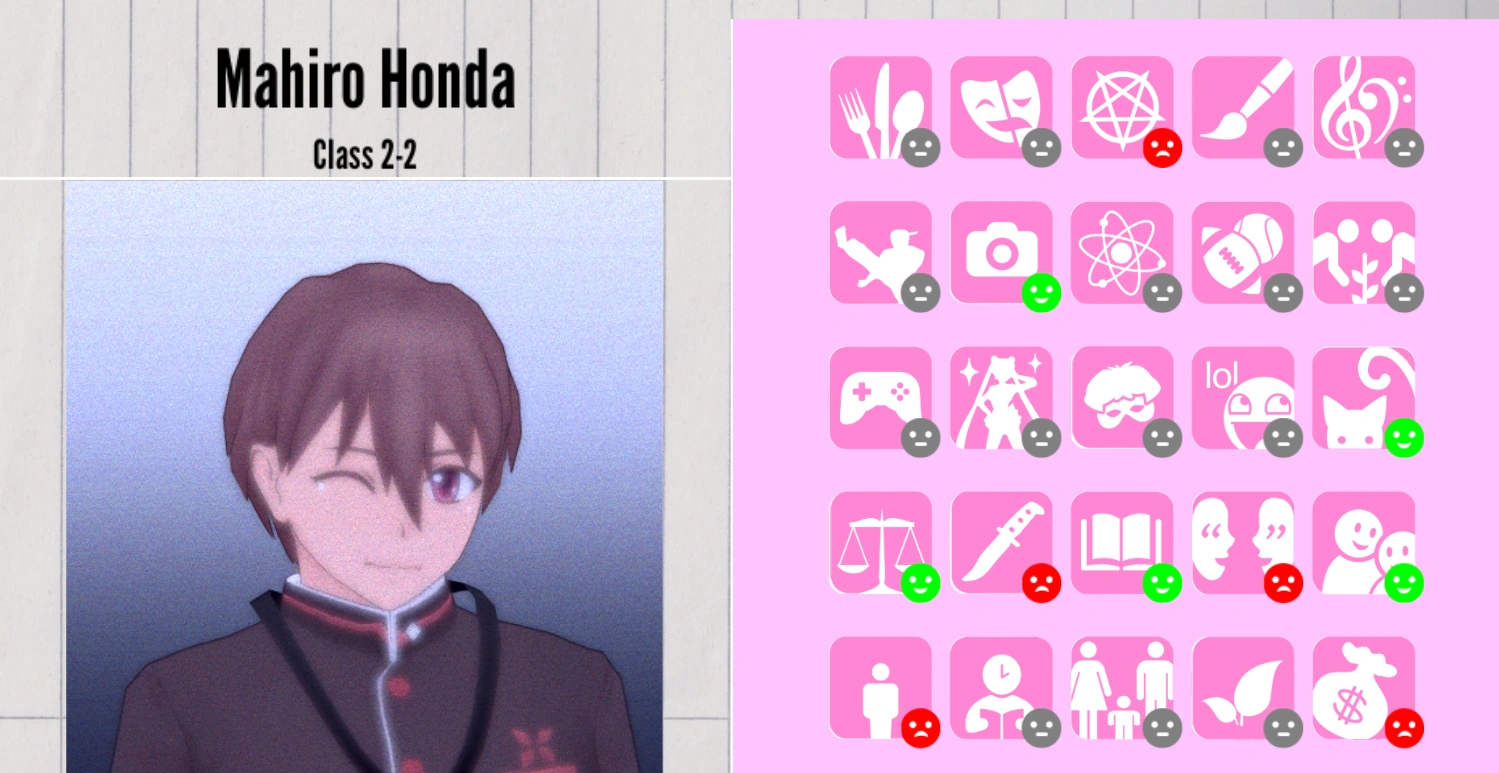 Among the Personas that are currently implemented in the game, Mahiro is a Sleuth. When the school atmosphere is above 80%, he will act upon the Snitch persona if he sees Ryoba Aishi commit murder or if he finds a corpse.