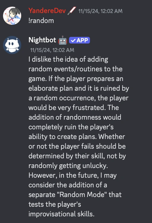 YandereDev is interested in adding a Random Mode where it tests the player's improvisational skills. The reason for is this because if the player prepares an elaborate plan and the plan foils due to a random occurrence, it would frustrate the player and ruin the player's ability to create any plans.[11]