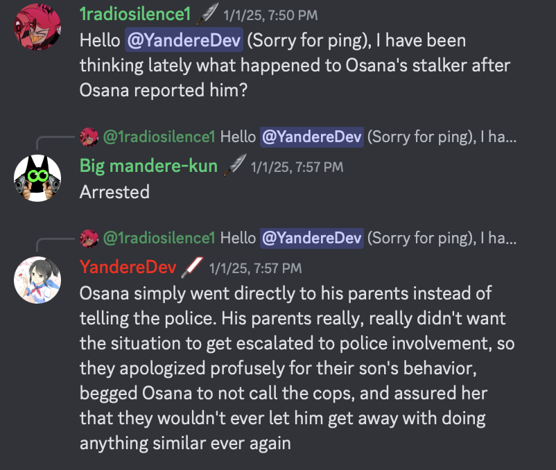 - Despite Osana saying she would report her son to the police, she simply went to her and her husband and told them about their son's behavior. They didn't want to escalate the situation by involving the police, so they profusely apologized for their son's behavior, all while begging Osana not to call the police and reassuring her that they wouldn't let him get away with something similar again.[3]