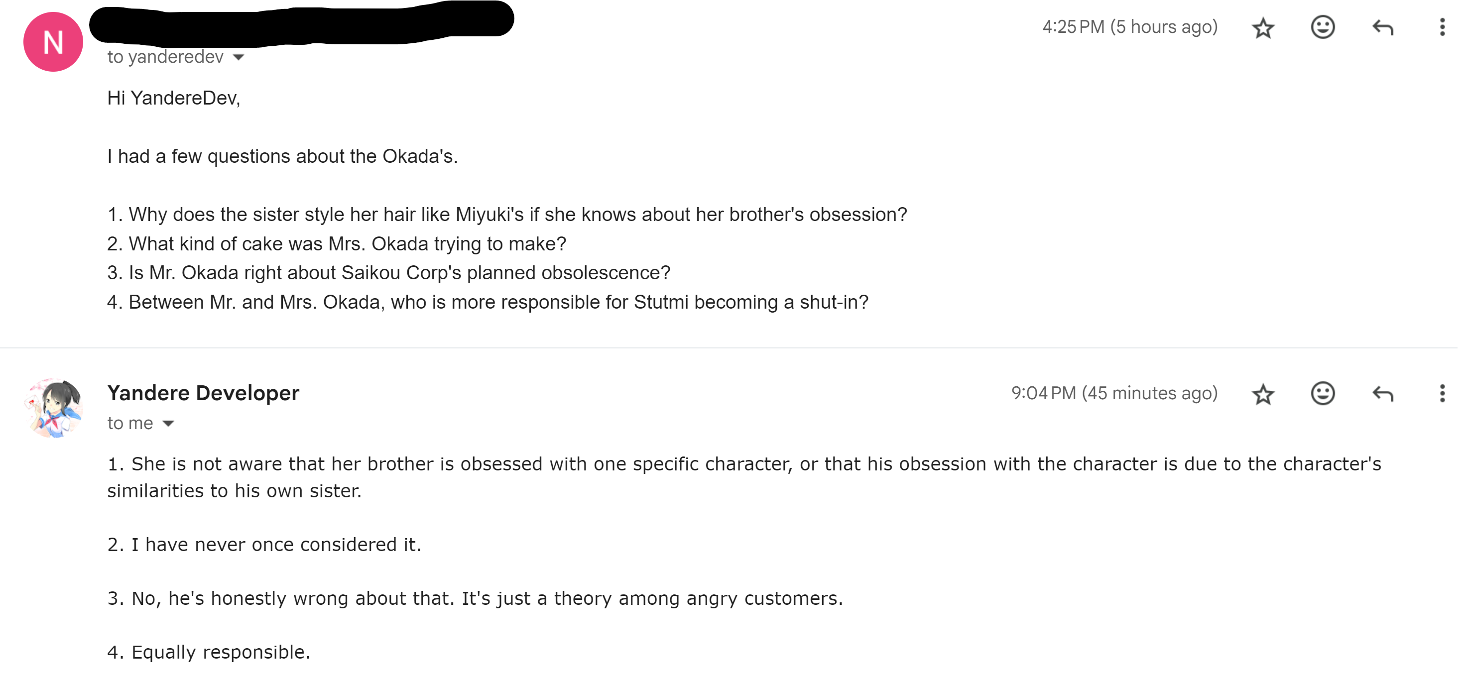 - YandereDev said Mrs. Okada and her husband are equally at fault for why Sutemi behaves the way he does.[1]