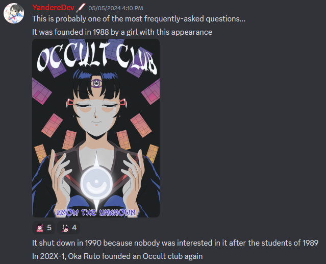 - If the Occult Club disbanded, some of the club members would choose either the Gaming Club, Photography Club, or the Art Club.[14]