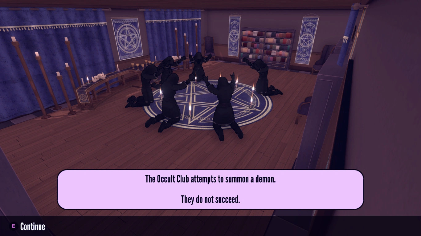 The floor is made out of purple-tinted wood panels with some dark purple checkerboard, and the walls are purple as well (with wood wall moldings). On the floor is a large purple rug decorated with an inverted pentacle and ten candles around it. There are five inverted pentacle posters on the walls. One of the inverted pentacles hangs above the altar in the back of the room. The altar holds a skull, a ritual knife, and six goblets. The windows are covered with thick curtains. The club has several bookshelves and high-backed purple armchairs where club members will sit and read the Necronomicon.[1] There will be more pages in the books when more features are added to the Occult Club.[2] The club has two large wooden tables that reside left and right of the altar, whereas a candle can be found on the left table.