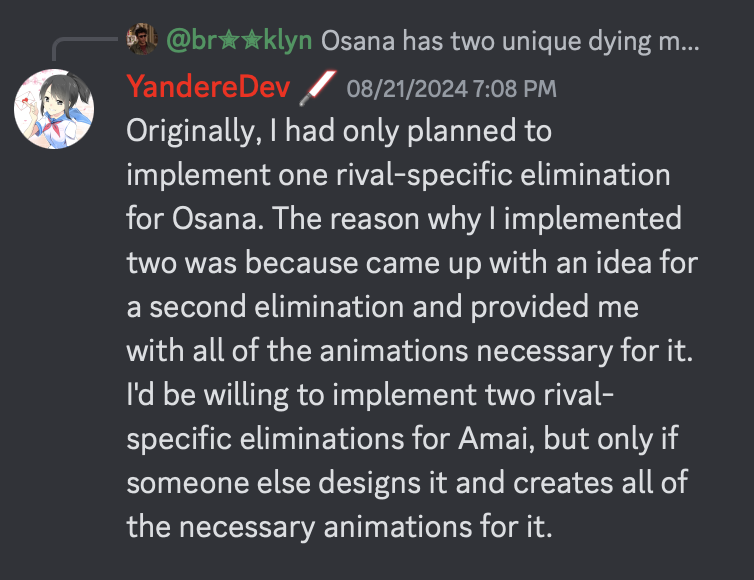 - Osana was originally planned to have one rival-specific elimination. The reason as to why there is two for her was because the second elimination was provided with animations necessary for it.[3]