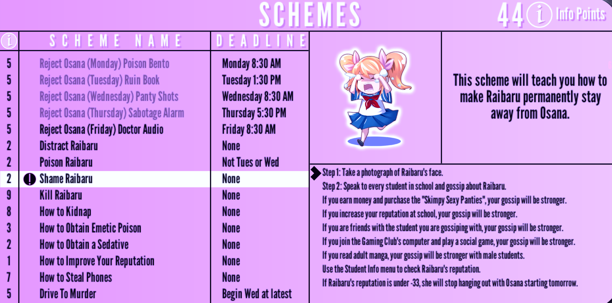 Shame Raibaru | None | "This scheme will teach you how to make Raibaru permanently stay away from Osana." | 2 Info Points | None |