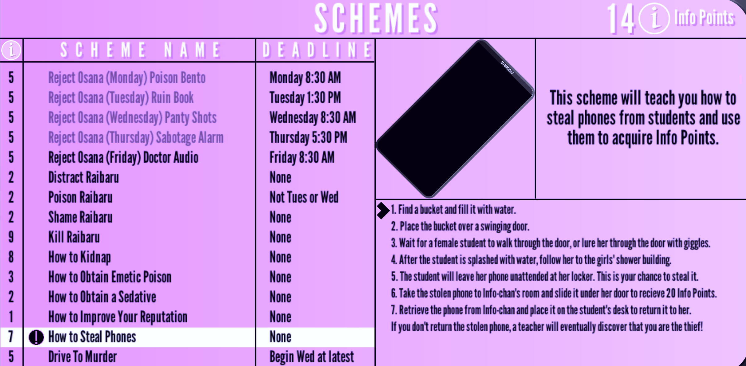 How to Steal Phones | None | "This scheme will teach you how to steal phones from students and use them to acquire Info Points." | 7 Info Points | None |