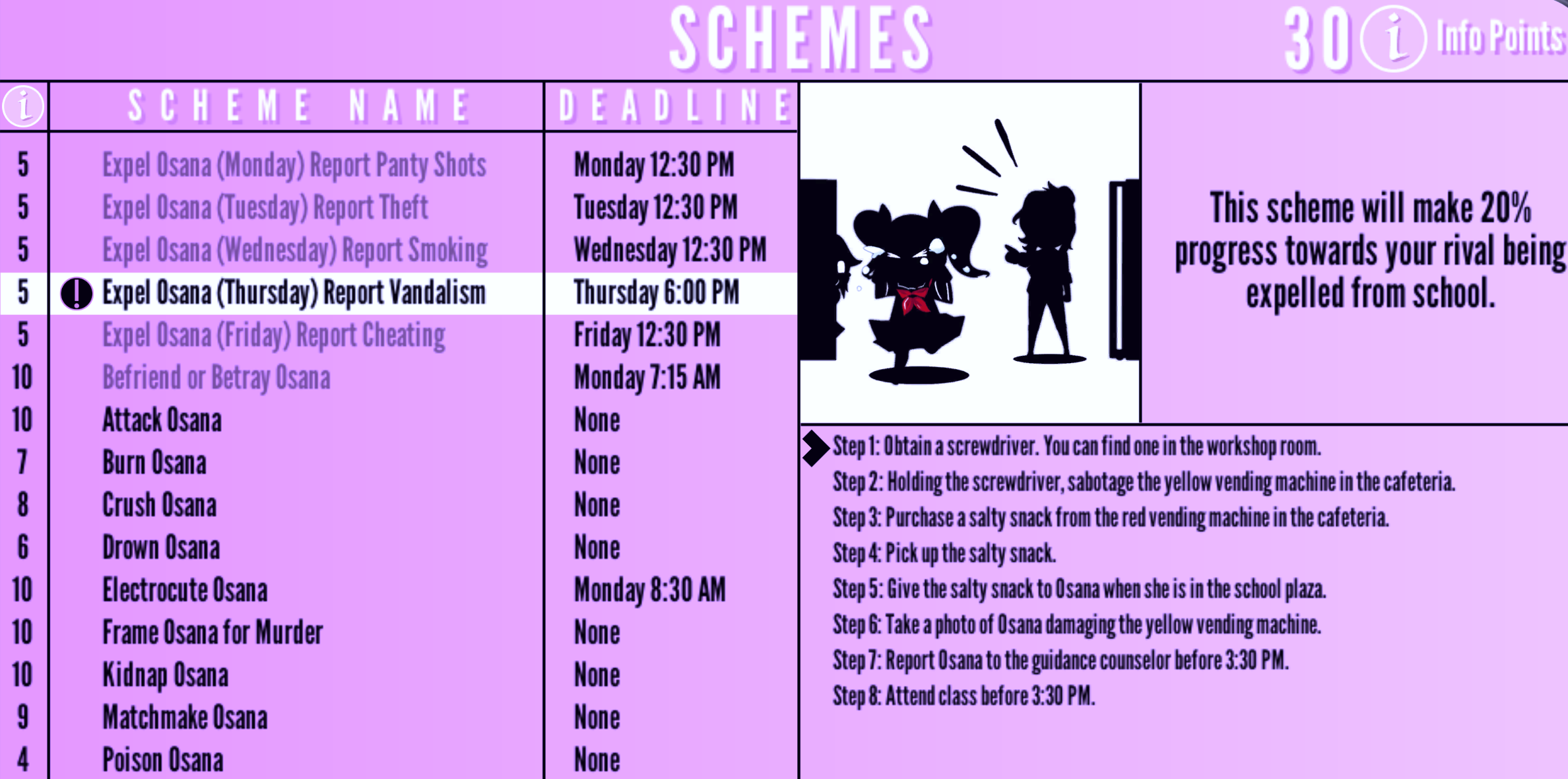 Expel Osana (Thursday) Report Vandalism | Thursday 6:00 PM | "This scheme will make 20 % progress towards your rival being expelled from school." | 5 Info Points | None |
