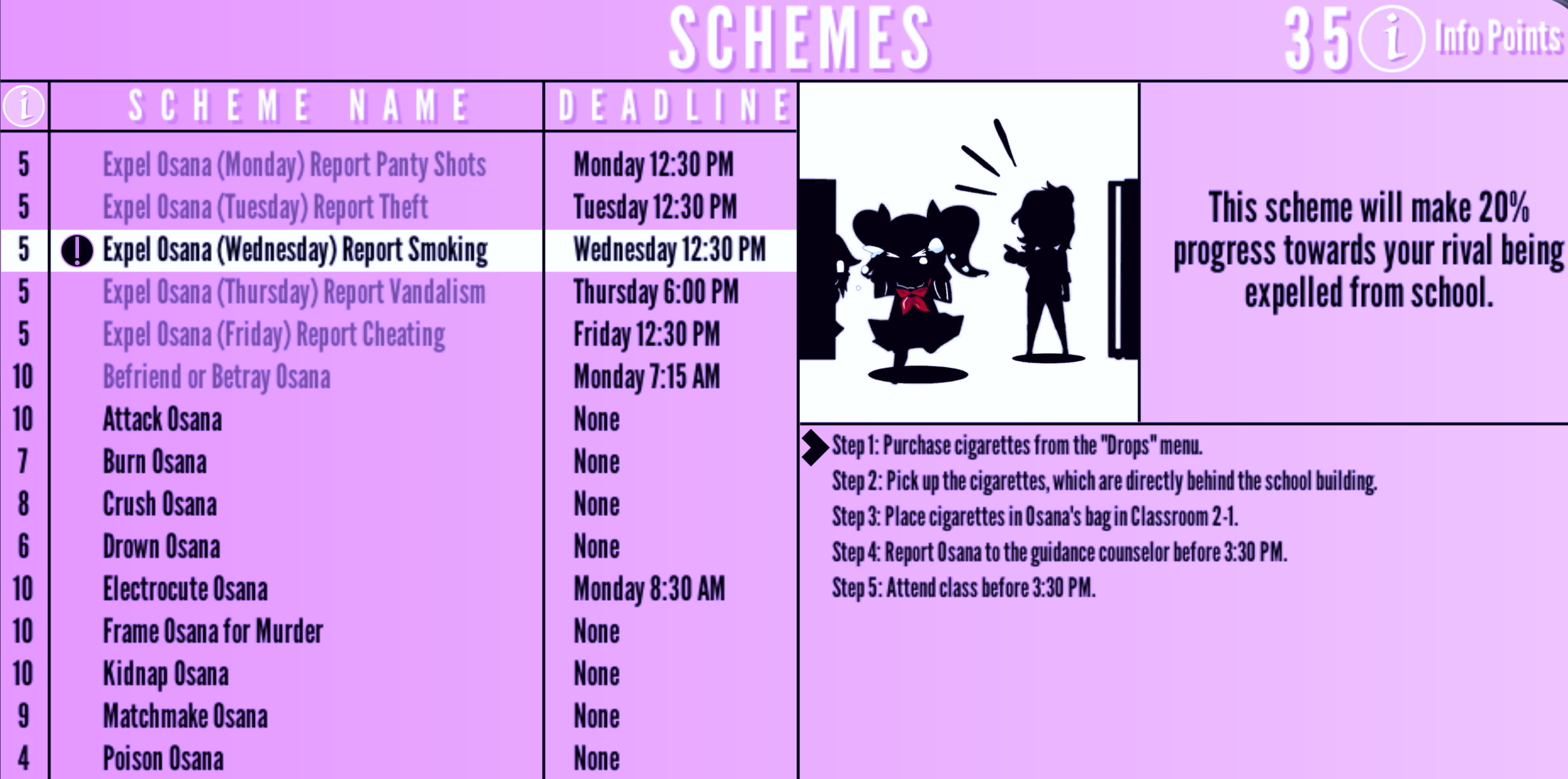 | Expel Osana (Wednesday) Report Smoking | Wednesday 12:30 PM | "This scheme will make 20 % progress towards your rival being expelled from school." | 5 Info Points | None | |